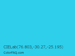 CIELab 76.803,-30.27,-25.195 Color is a normal cyan color and the nearest color is Scooter #2ebfd4. Hex code #2ecfeb and RGB value is rgb(46,207,235). In RGB color space, this color is composed of 18% red, 81% green, 92% blue, In CMYK color space, this color is composed of 80% cyan, 12% magenta, 0% yellow , 8% black , In HSL color space, this color has a hue angle of 189° , 83% saturation and 55% lightness.