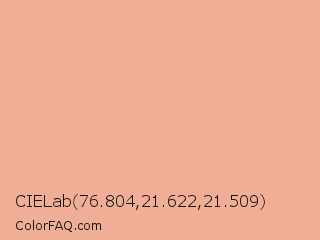 CIELab 76.804,21.622,21.509 Color is a light color and the nearest color is Rose Bud #fbb2a3. Hex code #f1ae97 and RGB value is rgb(241,174,151). In RGB color space, this color is composed of 95% red, 68% green, 59% blue, In CMYK color space, this color is composed of 0% cyan, 28% magenta, 37% yellow , 5% black , In HSL color space, this color has a hue angle of 15° , 76% saturation and 77% lightness.