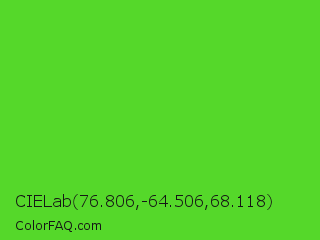 CIELab 76.806,-64.506,68.118 Color is a normal green color and the nearest color is Harlequin Green #46cb18. Hex code #55d82a and RGB value is rgb(85,216,42). In RGB color space, this color is composed of 33% red, 85% green, 16% blue, In CMYK color space, this color is composed of 61% cyan, 0% magenta, 81% yellow , 15% black , In HSL color space, this color has a hue angle of 105° , 69% saturation and 51% lightness.