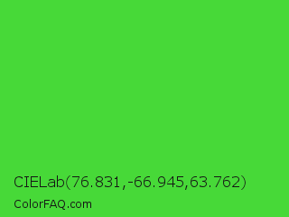 CIELab 76.831,-66.945,63.762 Color is a normal green color and the nearest color is Lime Green #32cd32. Hex code #47d938 and RGB value is rgb(71,217,56). In RGB color space, this color is composed of 28% red, 85% green, 22% blue, In CMYK color space, this color is composed of 67% cyan, 0% magenta, 74% yellow , 15% black , In HSL color space, this color has a hue angle of 114° , 68% saturation and 54% lightness.
