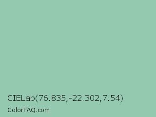 CIELab 76.835,-22.302,7.54 Color is a light green color and the nearest color is Shadow Green #9ac2b8. Hex code #95c9af and RGB value is rgb(149,201,175). In RGB color space, this color is composed of 58% red, 79% green, 69% blue, In CMYK color space, this color is composed of 26% cyan, 0% magenta, 13% yellow , 21% black , In HSL color space, this color has a hue angle of 150° , 33% saturation and 69% lightness.