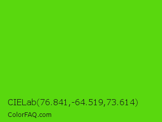CIELab 76.841,-64.519,73.614 Color is a normal green color and the nearest color is Harlequin Green #46cb18. Hex code #59d80e and RGB value is rgb(89,216,14). In RGB color space, this color is composed of 35% red, 85% green, 5% blue, In CMYK color space, this color is composed of 59% cyan, 0% magenta, 94% yellow , 15% black , In HSL color space, this color has a hue angle of 98° , 88% saturation and 45% lightness.