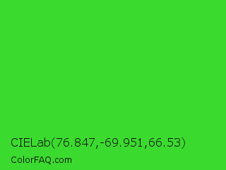 CIELab 76.847,-69.951,66.53 Color is a normal green color and the nearest color is Lime Green #32cd32. Hex code #3bda2f and RGB value is rgb(59,218,47). In RGB color space, this color is composed of 23% red, 85% green, 18% blue, In CMYK color space, this color is composed of 73% cyan, 0% magenta, 78% yellow , 15% black , In HSL color space, this color has a hue angle of 116° , 70% saturation and 52% lightness.