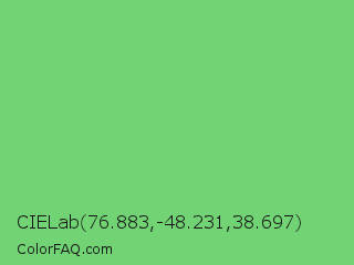 CIELab 76.883,-48.231,38.697 Color is a light green color and the nearest color is Pastel Green #77dd77. Hex code #71d373 and RGB value is rgb(113,211,115). In RGB color space, this color is composed of 44% red, 83% green, 45% blue, In CMYK color space, this color is composed of 46% cyan, 0% magenta, 45% yellow , 17% black , In HSL color space, this color has a hue angle of 121° , 53% saturation and 64% lightness.