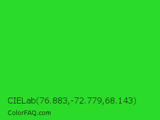 CIELab 76.883,-72.779,68.143 Color is a normal green color and the nearest color is Lime Green #32cd32. Hex code #2bdb29 and RGB value is rgb(43,219,41). In RGB color space, this color is composed of 17% red, 86% green, 16% blue, In CMYK color space, this color is composed of 80% cyan, 0% magenta, 81% yellow , 14% black , In HSL color space, this color has a hue angle of 119° , 71% saturation and 51% lightness.
