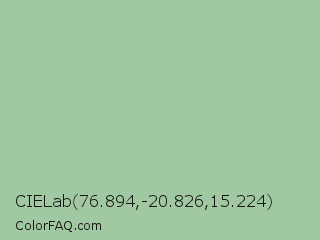 CIELab 76.894,-20.826,15.224 Color is a light green color and the nearest color is Eton Blue #96c8a2. Hex code #a0c8a1 and RGB value is rgb(160,200,161). In RGB color space, this color is composed of 63% red, 78% green, 63% blue, In CMYK color space, this color is composed of 20% cyan, 0% magenta, 20% yellow , 22% black , In HSL color space, this color has a hue angle of 122° , 27% saturation and 71% lightness.