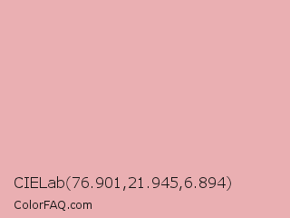 CIELab 76.901,21.945,6.894 Color is a light red color and the nearest color is Shilo #e8b9b3. Hex code #eaafb2 and RGB value is rgb(234,175,178). In RGB color space, this color is composed of 92% red, 69% green, 70% blue, In CMYK color space, this color is composed of 0% cyan, 25% magenta, 24% yellow , 8% black , In HSL color space, this color has a hue angle of 357° , 58% saturation and 80% lightness.