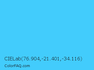 CIELab 76.904,-21.401,-34.116 Color is a light blue color and the nearest color is Picton Blue #45b1e8. Hex code #42ccfc and RGB value is rgb(66,204,252). In RGB color space, this color is composed of 26% red, 80% green, 99% blue, In CMYK color space, this color is composed of 74% cyan, 19% magenta, 0% yellow , 1% black , In HSL color space, this color has a hue angle of 195° , 97% saturation and 62% lightness.