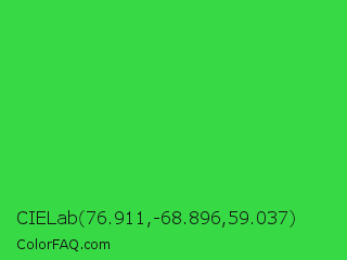 CIELab 76.911,-68.896,59.037 Color is a normal green color and the nearest color is Lime Green #32cd32. Hex code #37da45 and RGB value is rgb(55,218,69). In RGB color space, this color is composed of 22% red, 85% green, 27% blue, In CMYK color space, this color is composed of 75% cyan, 0% magenta, 68% yellow , 15% black , In HSL color space, this color has a hue angle of 125° , 69% saturation and 54% lightness.
