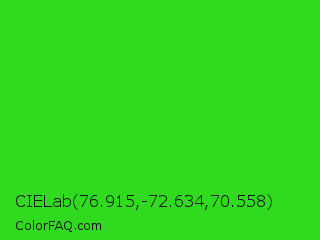 CIELab 76.915,-72.634,70.558 Color is a normal green color and the nearest color is Lime Green #32cd32. Hex code #30db1f and RGB value is rgb(48,219,31). In RGB color space, this color is composed of 19% red, 86% green, 12% blue, In CMYK color space, this color is composed of 78% cyan, 0% magenta, 86% yellow , 14% black , In HSL color space, this color has a hue angle of 115° , 75% saturation and 49% lightness.