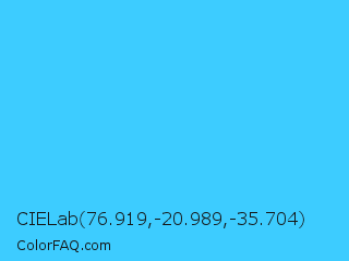 CIELab 76.919,-20.989,-35.704 Color is a light blue color and the nearest color is Picton Blue #45b1e8. Hex code #3dccff and RGB value is rgb(61,204,255). In RGB color space, this color is composed of 24% red, 80% green, 100% blue, In CMYK color space, this color is composed of 76% cyan, 20% magenta, 0% yellow , 0% black , In HSL color space, this color has a hue angle of 196° , 100% saturation and 62% lightness.