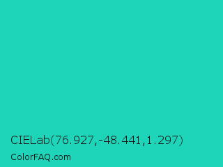 CIELab 76.927,-48.441,1.297 Color is a normal cyan color and the nearest color is Java #1fc2c2. Hex code #1ed5ba and RGB value is rgb(30,213,186). In RGB color space, this color is composed of 12% red, 84% green, 73% blue, In CMYK color space, this color is composed of 86% cyan, 0% magenta, 13% yellow , 16% black , In HSL color space, this color has a hue angle of 171° , 75% saturation and 48% lightness.