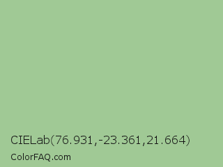 CIELab 76.931,-23.361,21.664 Color is a light green color and the nearest color is Eton Blue #96c8a2. Hex code #a0c995 and RGB value is rgb(160,201,149). In RGB color space, this color is composed of 63% red, 79% green, 58% blue, In CMYK color space, this color is composed of 20% cyan, 0% magenta, 26% yellow , 21% black , In HSL color space, this color has a hue angle of 107° , 33% saturation and 69% lightness.