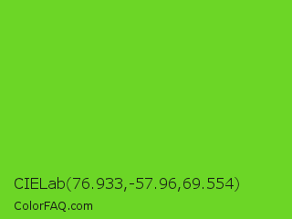 CIELab 76.933,-57.96,69.554 Color is a normal green color and the nearest color is Lima #76bd17. Hex code #6cd626 and RGB value is rgb(108,214,38). In RGB color space, this color is composed of 42% red, 84% green, 15% blue, In CMYK color space, this color is composed of 50% cyan, 0% magenta, 82% yellow , 16% black , In HSL color space, this color has a hue angle of 96° , 70% saturation and 49% lightness.