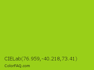 CIELab 76.959,-40.218,73.41 Color is a normal lime color and the nearest color is Bahia #a5cb0c. Hex code #99cf18 and RGB value is rgb(153,207,24). In RGB color space, this color is composed of 60% red, 81% green, 9% blue, In CMYK color space, this color is composed of 26% cyan, 0% magenta, 88% yellow , 19% black , In HSL color space, this color has a hue angle of 78° , 79% saturation and 45% lightness.
