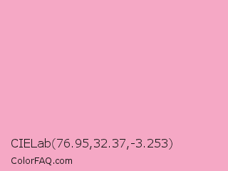 CIELab 76.95,32.37,-3.253 Color is a very light rose color and the nearest color is Nadeshiko Pink #f6adc6. Hex code #f5a8c5 and RGB value is rgb(245,168,197). In RGB color space, this color is composed of 96% red, 66% green, 77% blue, In CMYK color space, this color is composed of 0% cyan, 31% magenta, 20% yellow , 4% black , In HSL color space, this color has a hue angle of 337° , 79% saturation and 81% lightness.