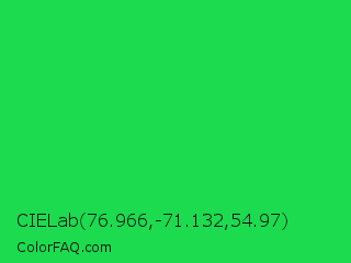 CIELab 76.966,-71.132,54.97 Color is a normal green color and the nearest color is Malachite #0bda51. Hex code #1cdb4f and RGB value is rgb(28,219,79). In RGB color space, this color is composed of 11% red, 86% green, 31% blue, In CMYK color space, this color is composed of 87% cyan, 0% magenta, 64% yellow , 14% black , In HSL color space, this color has a hue angle of 136° , 77% saturation and 48% lightness.