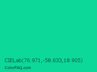 CIELab 76.971,-58.633,18.905 Color is a normal green color and the nearest color is Caribbean Green #00cc99. Hex code #0bd899 and RGB value is rgb(11,216,153). In RGB color space, this color is composed of 4% red, 85% green, 60% blue, In CMYK color space, this color is composed of 95% cyan, 0% magenta, 29% yellow , 15% black , In HSL color space, this color has a hue angle of 162° , 90% saturation and 45% lightness.