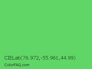 CIELab 76.972,-55.961,44.99 Color is a light green color and the nearest color is Emerald #50c878. Hex code #5fd666 and RGB value is rgb(95,214,102). In RGB color space, this color is composed of 37% red, 84% green, 40% blue, In CMYK color space, this color is composed of 56% cyan, 0% magenta, 52% yellow , 16% black , In HSL color space, this color has a hue angle of 124° , 59% saturation and 61% lightness.