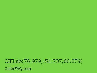 CIELab 76.979,-51.737,60.079 Color is a normal green color and the nearest color is Kiwi #8ee53f. Hex code #78d444 and RGB value is rgb(120,212,68). In RGB color space, this color is composed of 47% red, 83% green, 27% blue, In CMYK color space, this color is composed of 43% cyan, 0% magenta, 68% yellow , 17% black , In HSL color space, this color has a hue angle of 98° , 63% saturation and 55% lightness.