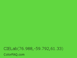 CIELab 76.988,-59.792,61.33 Color is a normal green color and the nearest color is Green RYB #66b032. Hex code #61d740 and RGB value is rgb(97,215,64). In RGB color space, this color is composed of 38% red, 84% green, 25% blue, In CMYK color space, this color is composed of 55% cyan, 0% magenta, 70% yellow , 16% black , In HSL color space, this color has a hue angle of 107° , 65% saturation and 55% lightness.