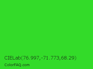 CIELab 76.997,-71.773,68.29 Color is a normal green color and the nearest color is Lime Green #32cd32. Hex code #33db29 and RGB value is rgb(51,219,41). In RGB color space, this color is composed of 20% red, 86% green, 16% blue, In CMYK color space, this color is composed of 77% cyan, 0% magenta, 81% yellow , 14% black , In HSL color space, this color has a hue angle of 117° , 71% saturation and 51% lightness.
