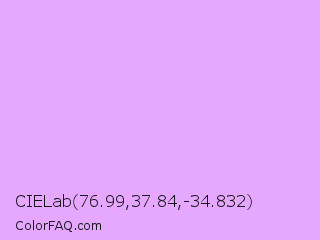 CIELab 76.99,37.84,-34.832 Color is a very light purple color and the nearest color is Mauve #e0b0ff. Hex code #e5a7ff and RGB value is rgb(229,167,255). In RGB color space, this color is composed of 90% red, 65% green, 100% blue, In CMYK color space, this color is composed of 10% cyan, 35% magenta, 0% yellow , 0% black , In HSL color space, this color has a hue angle of 282° , 100% saturation and 83% lightness.