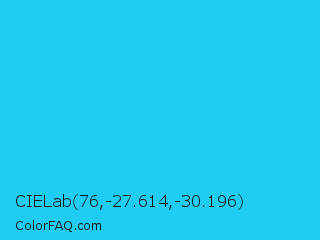 CIELab 76,-27.614,-30.196 Color is a normal cyan color and the nearest color is Spiro Disco Ball #0fc0fc. Hex code #1fccf2 and RGB value is rgb(31,204,242). In RGB color space, this color is composed of 12% red, 80% green, 95% blue, In CMYK color space, this color is composed of 87% cyan, 16% magenta, 0% yellow , 5% black , In HSL color space, this color has a hue angle of 191° , 89% saturation and 54% lightness.