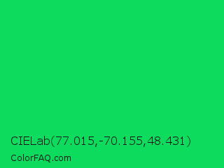 CIELab 77.015,-70.155,48.431 Color is a normal green color and the nearest color is Malachite #0bda51. Hex code #0ddb5e and RGB value is rgb(13,219,94). In RGB color space, this color is composed of 5% red, 86% green, 37% blue, In CMYK color space, this color is composed of 94% cyan, 0% magenta, 57% yellow , 14% black , In HSL color space, this color has a hue angle of 144° , 89% saturation and 45% lightness.