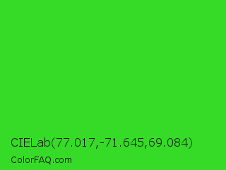 CIELab 77.017,-71.645,69.084 Color is a normal green color and the nearest color is Lime Green #32cd32. Hex code #35db26 and RGB value is rgb(53,219,38). In RGB color space, this color is composed of 21% red, 86% green, 15% blue, In CMYK color space, this color is composed of 76% cyan, 0% magenta, 83% yellow , 14% black , In HSL color space, this color has a hue angle of 115° , 72% saturation and 50% lightness.