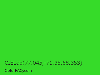 CIELab 77.045,-71.35,68.353 Color is a normal green color and the nearest color is Lime Green #32cd32. Hex code #36db29 and RGB value is rgb(54,219,41). In RGB color space, this color is composed of 21% red, 86% green, 16% blue, In CMYK color space, this color is composed of 75% cyan, 0% magenta, 81% yellow , 14% black , In HSL color space, this color has a hue angle of 116° , 71% saturation and 51% lightness.