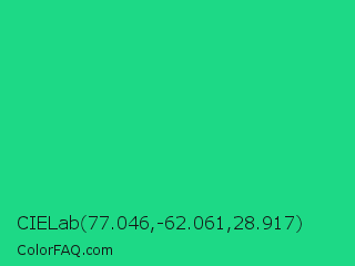CIELab 77.046,-62.061,28.917 Color is a normal green color and the nearest color is Shamrock #33cc99. Hex code #1dd986 and RGB value is rgb(29,217,134). In RGB color space, this color is composed of 11% red, 85% green, 53% blue, In CMYK color space, this color is composed of 87% cyan, 0% magenta, 38% yellow , 15% black , In HSL color space, this color has a hue angle of 154° , 76% saturation and 48% lightness.