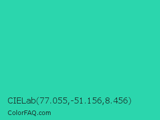 CIELab 77.055,-51.156,8.456 Color is a normal cyan color and the nearest color is Shamrock #33cc99. Hex code #2bd6ad and RGB value is rgb(43,214,173). In RGB color space, this color is composed of 17% red, 84% green, 68% blue, In CMYK color space, this color is composed of 80% cyan, 0% magenta, 19% yellow , 16% black , In HSL color space, this color has a hue angle of 166° , 68% saturation and 50% lightness.