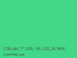 CIELab 77.059,-56.192,26.969 Color is a normal green color and the nearest color is Shamrock #33cc99. Hex code #43d78a and RGB value is rgb(67,215,138). In RGB color space, this color is composed of 26% red, 84% green, 54% blue, In CMYK color space, this color is composed of 69% cyan, 0% magenta, 36% yellow , 16% black , In HSL color space, this color has a hue angle of 149° , 65% saturation and 55% lightness.