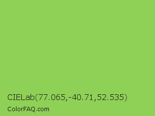 CIELab 77.065,-40.71,52.535 Color is a normal green color and the nearest color is Dollar Bill #85bb65. Hex code #8fd057 and RGB value is rgb(143,208,87). In RGB color space, this color is composed of 56% red, 82% green, 34% blue, In CMYK color space, this color is composed of 31% cyan, 0% magenta, 58% yellow , 18% black , In HSL color space, this color has a hue angle of 92° , 56% saturation and 58% lightness.