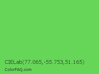 CIELab 77.065,-55.753,51.165 Color is a normal green color and the nearest color is Mantis #74c365. Hex code #66d659 and RGB value is rgb(102,214,89). In RGB color space, this color is composed of 40% red, 84% green, 35% blue, In CMYK color space, this color is composed of 52% cyan, 0% magenta, 58% yellow , 16% black , In HSL color space, this color has a hue angle of 114° , 60% saturation and 59% lightness.