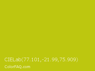 CIELab 77.101,-21.99,75.909 Color is a normal yellow color and the nearest color is Rio Grande #bbd009. Hex code #bdc70f and RGB value is rgb(189,199,15). In RGB color space, this color is composed of 74% red, 78% green, 6% blue, In CMYK color space, this color is composed of 5% cyan, 0% magenta, 92% yellow , 22% black , In HSL color space, this color has a hue angle of 63° , 86% saturation and 42% lightness.