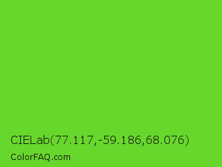 CIELab 77.117,-59.186,68.076 Color is a normal green color and the nearest color is Lima #76bd17. Hex code #68d72c and RGB value is rgb(104,215,44). In RGB color space, this color is composed of 41% red, 84% green, 17% blue, In CMYK color space, this color is composed of 52% cyan, 0% magenta, 80% yellow , 16% black , In HSL color space, this color has a hue angle of 99° , 68% saturation and 51% lightness.