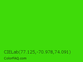 CIELab 77.125,-70.978,74.091 Color is a normal green color and the nearest color is Harlequin Green #46cb18. Hex code #3fdb09 and RGB value is rgb(63,219,9). In RGB color space, this color is composed of 25% red, 86% green, 4% blue, In CMYK color space, this color is composed of 71% cyan, 0% magenta, 96% yellow , 14% black , In HSL color space, this color has a hue angle of 105° , 92% saturation and 45% lightness.