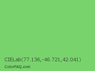 CIELab 77.136,-46.721,42.041 Color is a light green color and the nearest color is Pastel Green #77dd77. Hex code #79d36d and RGB value is rgb(121,211,109). In RGB color space, this color is composed of 47% red, 83% green, 43% blue, In CMYK color space, this color is composed of 43% cyan, 0% magenta, 48% yellow , 17% black , In HSL color space, this color has a hue angle of 113° , 54% saturation and 63% lightness.