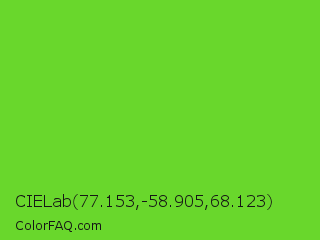 CIELab 77.153,-58.905,68.123 Color is a normal green color and the nearest color is Lima #76bd17. Hex code #69d72c and RGB value is rgb(105,215,44). In RGB color space, this color is composed of 41% red, 84% green, 17% blue, In CMYK color space, this color is composed of 51% cyan, 0% magenta, 80% yellow , 16% black , In HSL color space, this color has a hue angle of 99° , 68% saturation and 51% lightness.