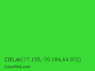 CIELab 77.155,-70.184,64.972 Color is a normal green color and the nearest color is Lime Green #32cd32. Hex code #39db35 and RGB value is rgb(57,219,53). In RGB color space, this color is composed of 22% red, 86% green, 21% blue, In CMYK color space, this color is composed of 74% cyan, 0% magenta, 76% yellow , 14% black , In HSL color space, this color has a hue angle of 119° , 70% saturation and 53% lightness.