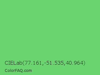 CIELab 77.161,-51.535,40.964 Color is a light green color and the nearest color is Pastel Green #77dd77. Hex code #6ad56f and RGB value is rgb(106,213,111). In RGB color space, this color is composed of 42% red, 84% green, 44% blue, In CMYK color space, this color is composed of 50% cyan, 0% magenta, 48% yellow , 16% black , In HSL color space, this color has a hue angle of 123° , 56% saturation and 63% lightness.