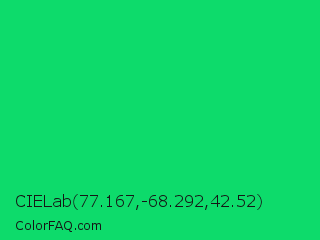 CIELab 77.167,-68.292,42.52 Color is a normal green color and the nearest color is Malachite #0bda51. Hex code #0ddb6b and RGB value is rgb(13,219,107). In RGB color space, this color is composed of 5% red, 86% green, 42% blue, In CMYK color space, this color is composed of 94% cyan, 0% magenta, 51% yellow , 14% black , In HSL color space, this color has a hue angle of 147° , 89% saturation and 45% lightness.