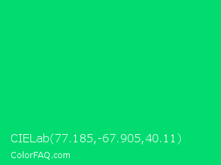 CIELab 77.185,-67.905,40.11 Color is a normal green color and the nearest color is Malachite #0bda51. Hex code #01db70 and RGB value is rgb(1,219,112). In RGB color space, this color is composed of 0% red, 86% green, 44% blue, In CMYK color space, this color is composed of 100% cyan, 0% magenta, 49% yellow , 14% black , In HSL color space, this color has a hue angle of 151° , 99% saturation and 43% lightness.