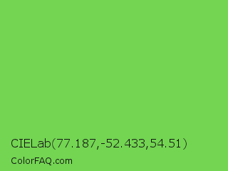 CIELab 77.187,-52.433,54.51 Color is a normal green color and the nearest color is Mantis #74c365. Hex code #73d552 and RGB value is rgb(115,213,82). In RGB color space, this color is composed of 45% red, 84% green, 32% blue, In CMYK color space, this color is composed of 46% cyan, 0% magenta, 62% yellow , 16% black , In HSL color space, this color has a hue angle of 105° , 61% saturation and 58% lightness.