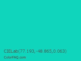 CIELab 77.193,-48.865,0.063 Color is a normal cyan color and the nearest color is Robins Egg Blue #00cccc. Hex code #0dd6bd and RGB value is rgb(13,214,189). In RGB color space, this color is composed of 5% red, 84% green, 74% blue, In CMYK color space, this color is composed of 94% cyan, 0% magenta, 12% yellow , 16% black , In HSL color space, this color has a hue angle of 173° , 89% saturation and 45% lightness.