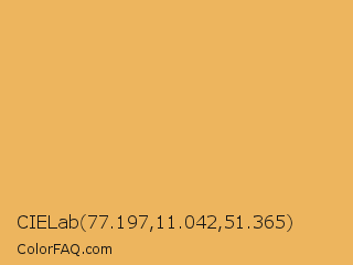 CIELab 77.197,11.042,51.365 Color is a light orange color and the nearest color is Porsche #eaae69. Hex code #edb55e and RGB value is rgb(237,181,94). In RGB color space, this color is composed of 93% red, 71% green, 37% blue, In CMYK color space, this color is composed of 0% cyan, 24% magenta, 60% yellow , 7% black , In HSL color space, this color has a hue angle of 37° , 80% saturation and 65% lightness.