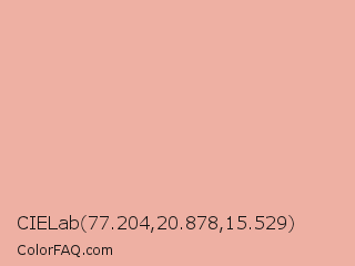 CIELab 77.204,20.878,15.529 Color is a light red color and the nearest color is Rose Bud #fbb2a3. Hex code #eeb0a3 and RGB value is rgb(238,176,163). In RGB color space, this color is composed of 93% red, 69% green, 64% blue, In CMYK color space, this color is composed of 0% cyan, 26% magenta, 32% yellow , 7% black , In HSL color space, this color has a hue angle of 10° , 69% saturation and 79% lightness.