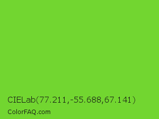 CIELab 77.211,-55.688,67.141 Color is a normal green color and the nearest color is Kiwi #8ee53f. Hex code #72d630 and RGB value is rgb(114,214,48). In RGB color space, this color is composed of 45% red, 84% green, 19% blue, In CMYK color space, this color is composed of 47% cyan, 0% magenta, 78% yellow , 16% black , In HSL color space, this color has a hue angle of 96° , 67% saturation and 51% lightness.